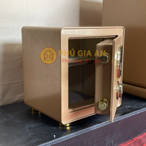 - Két sử dụng 2 chốt khóa inox nguyên thỏi 32mm chắc chắn. Nội thất bọc da họa tiết vuông màu vàng nhạt, sang trọng, dễ lau chùi và bền theo thời gian. Két được chia thành 2 ngăn, có thể điều chỉnh độ cao hoặc tháo rời để chứa đồ vật lớn.