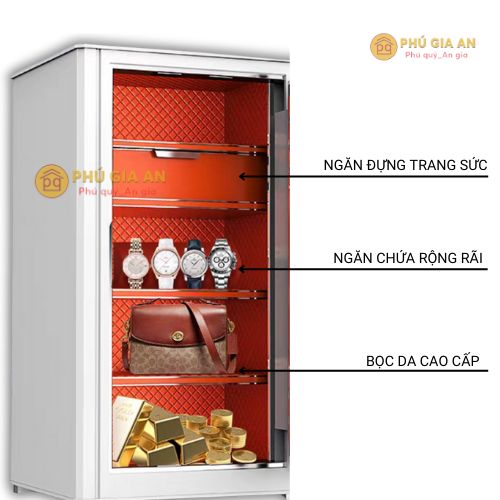 - Nội thất cao cấp của két sắt cũng là điểm nhấn đặc biệt. Lớp da dập nổi tạo nên sự thời trang và sang trọng. Các ngăn kéo đựng đồ trang sức được thiết kế tỉ mỉ và tinh tế, thể hiện đẳng cấp của sản phẩm. Ngoài ra, két còn hỗ trợ hộp xoay đồng hồ, mang đến sự tiện nghi và đẳng cấp cho người sử dụng.
