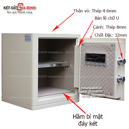 - Có ngăn bí mật dưới đáy két - ngay cả khi két bị kẻ gian mở ra, tài sản trong "Hầm" bí mật này vẫn có thể an toàn. (Chi tiết này được thiết kế sau khi đã nghiên cứu rất kỹ tâm lý - hành vi kẻ gian)