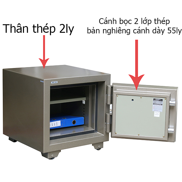 - Két có vỏ thép toàn thân dày 2mm, cánh cửa được bọc 2 lớp thép kết hợp với công nghệ gấp .Bản nghiêng cánh cửa dày tới 55mm, tăng cường khả năng chống cạy két, vượt trội hơn các két sắt thông thường (thường có vỏ thép từ 0,6-1mm, bản cánh chỉ từ 15-30mm).