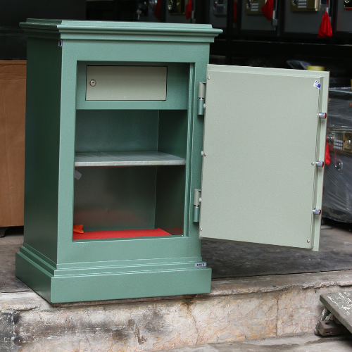 - Thiết kế dạng két đứng, trang bị một khóa chìa, một khóa mã điện tử và một núm tay nắm.