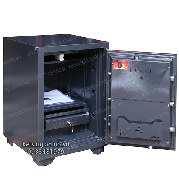 - Thiết kế thông minh: Tối ưu hóa diện tích trong lòng két với 1 đợt chia ngăn để sắp xếp giấy tờ, 1 ngăn kéo phụ để chứa đồ nhỏ, và 1 ngăn hầm bí mật dưới đáy két để bảo vệ các đồ vật giá trị như vàng bạc, trang sức.