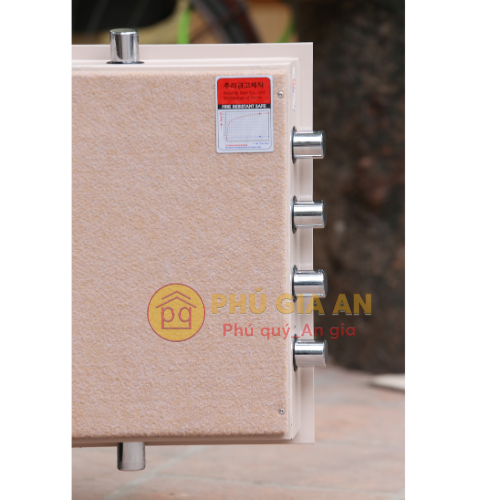 - Hệ thống chốt an toàn gồm 10 chốt Inox phi 32mm cắm sâu vào thân két theo 4 chiều, tạo sự kiên cố, chống cạy phá tối đa.