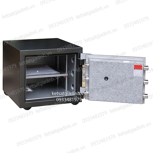 - Thân két gồm hai lớp thép mạ điện GA, kết hợp đá, thép hạt và vật liệu cách nhiệt giúp tăng khả năng chịu nhiệt và chống đục phá