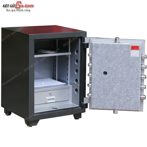 - Thân két được chế tạo từ hai lớp thép mạ điện GA, kết hợp với đá, thép hạt và vật liệu cách nhiệt có khả năng chịu nhiệt cao, đồng thời đảm bảo tính chống đục phá vượt trội.