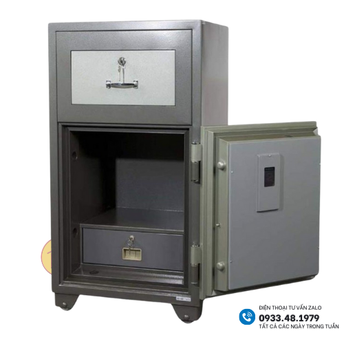Két được thiết kết ngăn kéo trên có khóa chìa + tay nắm khi mở ra, khi để đồ vào ( tiền hoặc giấy tờ), khi đóng lại, đồ tự động rơi - thả xuống khoang chứa phía dưới có khóa chìa + khóa mã an toàn.