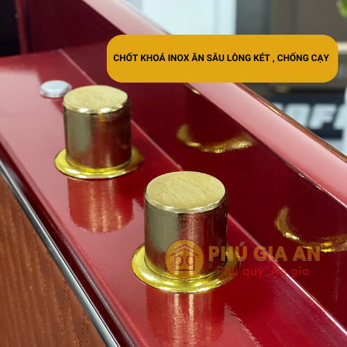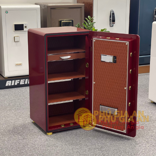 - Hệ thống khóa mở két: Kim loại mạ vàng và kính cường lực, chốt khóa inox nguyên khối.