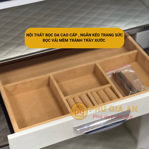 - Kích thước trong: Cao 970* Ngang 500 * Sâu 470 (bên trong có 1 khay kéo chia khay để trang sức cao 75mm + 2 đợt chia ngăn).