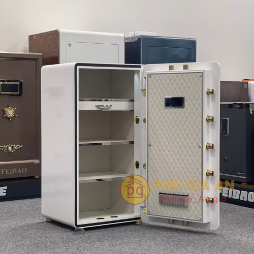 - Hệ thống khóa mở két: Kim loại mạ vàng và kính cường lực, chốt khóa inox nguyên khối.