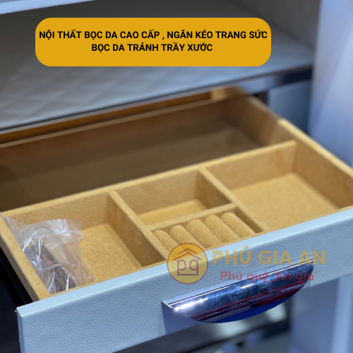 - Bố cục rộng rãi 2 ngăn lớn để giấy tờ, tiền bạc, tài sản giá trị. Hộc kéo bọc nhung dành riêng để cất giữ trang sức.