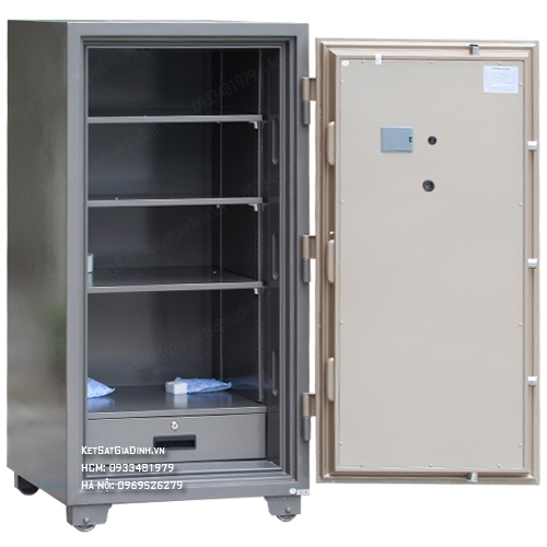 - Hệ thống khóa:Khóa mã điện tử + khóa chìa bi của hãng.Bàn phím điện tử tự sáng khi thao tác.Cài đặt mã số 3 – 8 ký tự, không giới hạn lần đổi.Có thể lắp pin bên trong hoặc bên ngoài két – tiện lợi khi thay pin