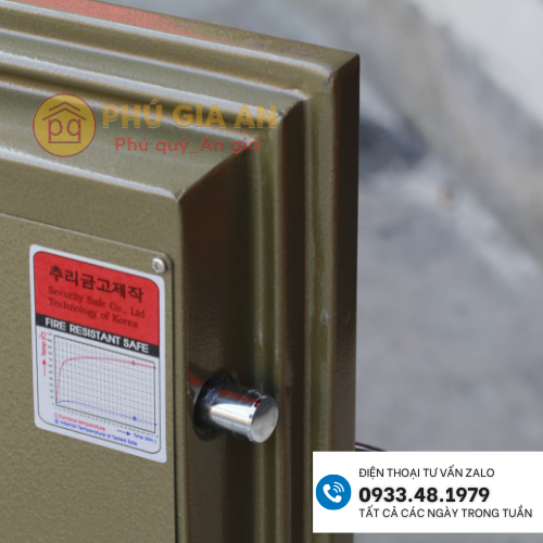 - 4 chốt an toàn xuyên sâu vào thân két, 2 bản lề thép dày giúp chống phá két hiệu quả.