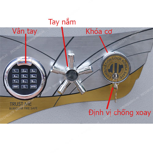 - Công nghệ khóa liên hoàn: Một khóa vân tay + một khóa điện tử + một khóa số cơ. Tay nắm chấu xoay, giúp thao tác mở két nhẹ nhàng hơn.