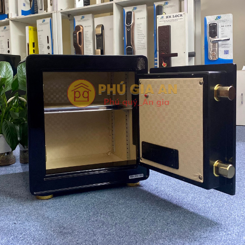 - Két sử dụng 2 chốt khóa inox nguyên thỏi 32mm chắc chắn. Nội thất bọc da họa tiết vuông màu vàng nhạt, sang trọng, dễ lau chùi và bền theo thời gian. Két được chia thành 2 ngăn, có thể điều chỉnh độ cao hoặc tháo rời để chứa đồ vật lớn.