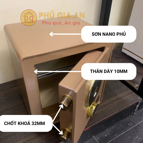 - Bề mặt két được phủ 4 lớp sơn gồm: sơn lót, sơn chống han gỉ, sơn chống cháy và sơn Nano trang trí, giúp tăng độ bóng và chống trầy xước.