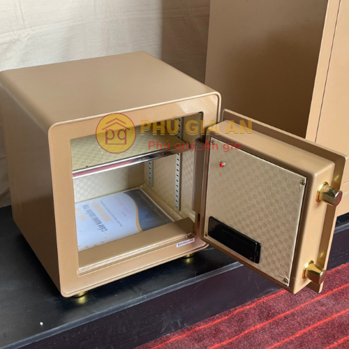 - Két sử dụng 2 chốt khóa inox nguyên thỏi 32mm chắc chắn. Nội thất bọc da họa tiết vuông màu vàng nhạt, sang trọng, dễ lau chùi và bền theo thời gian. Két được chia thành 2 ngăn, có thể điều chỉnh độ cao hoặc tháo rời để chứa đồ vật lớn.