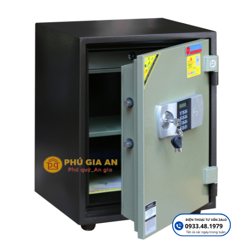 - Chất liệu: Thân két làm từ thép 2 lớp + vật liệu chống cháy cao cấp, tạo thành một khối vững chắc như đúc liền khối (khác biệt với két đổ cát thông thường).