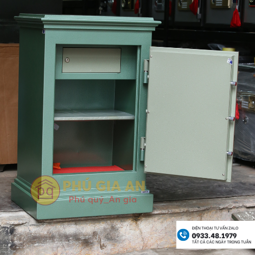 - Thiết kế dạng két đứng, trang bị một khóa chìa, một khóa mã điện tử và một núm tay nắm.