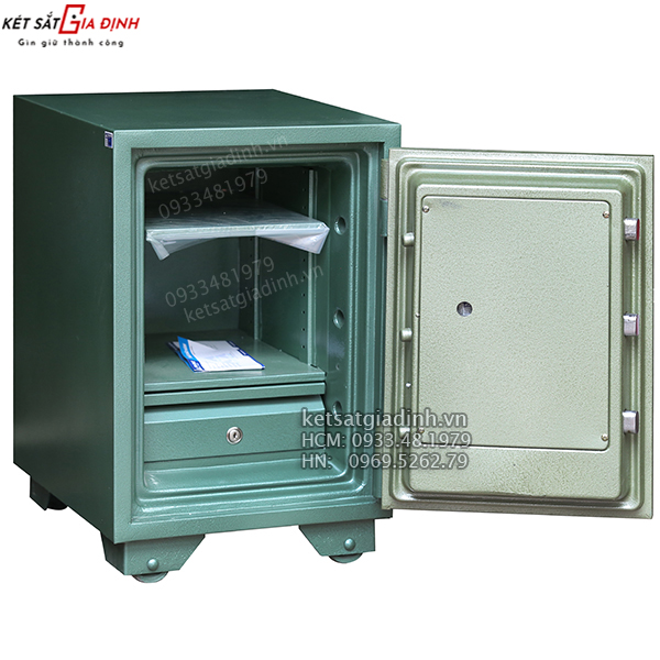 - Bên trong két có 01 ngăn kéo có khóa + 01 đợt di động.