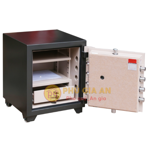 - Thân két được chế tạo từ hai lớp thép mạ điện GA, kết hợp với đá, thép hạt và vật liệu cách nhiệt có khả năng chịu nhiệt cao, đồng thời đảm bảo tính chống đục phá vượt trội.