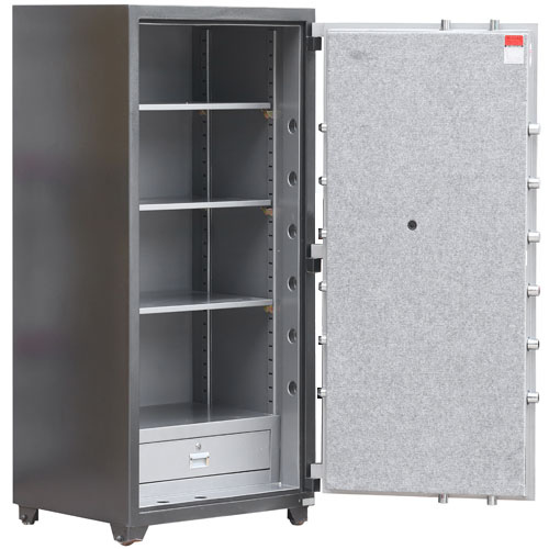 - Cửa két làm từ thép Carbon nguyên tấm dày 12mm (theo tiêu chuẩn JIS Nhật Bản), có độ 01 ngăn kéo có khóa chìa.