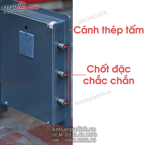- Cánh cửa là một điểm đặc biệt với thép tấm dày 8mm và hệ thống 6 chốt đặc 20mm, giúp tăng cường khả năng chống cạy phá. Ngoài ra, cửa két được thiết kế với bản lề ngoài làm từ thép tấm dày 4mm, cho phép cửa mở rộng đến 180 độ, mang lại sự tiện lợi khi sử dụng.