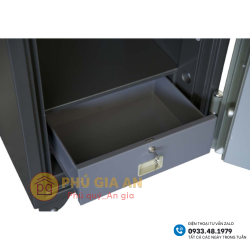 Két được thiết kết ngăn kéo trên có khóa chìa + tay nắm khi mở ra, khi để đồ vào ( tiền hoặc giấy tờ), khi đóng lại, đồ tự động rơi - thả xuống khoang chứa phía dưới có khóa chìa + khóa mã an toàn.