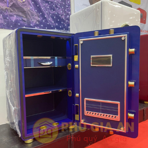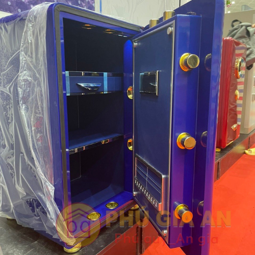 - Hệ thống khóa mở két: Kim loại mạ vàng và kính cường lực, chốt khóa inox nguyên khối.