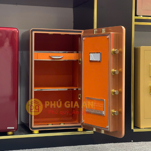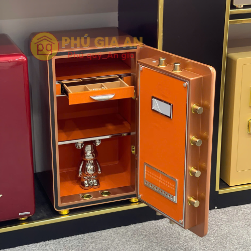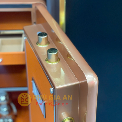 - Hệ thống khóa mở két: Kim loại mạ vàng và kính cường lực, chốt khóa inox nguyên khối.