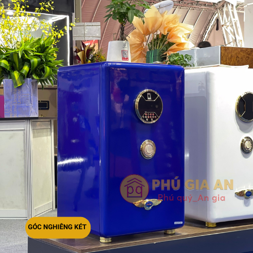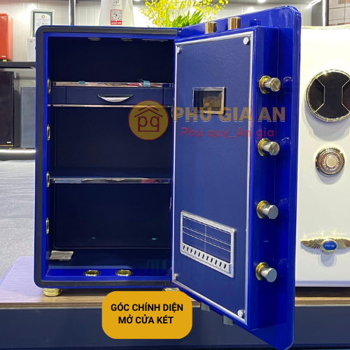 - Hệ thống khóa mở két: Kim loại mạ vàng và kính cường lực, chốt khóa inox nguyên khối.