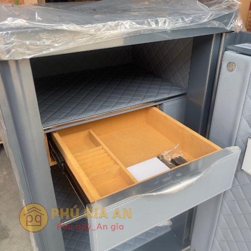 - Nội thất sang trọng với sơn Nano phủ bóng 3 lớp, vách ngăn và thành két bọc da PU cao cấp, chia thành nhiều ngăn bao gồm ngăn trang sức và ngăn bí mật.