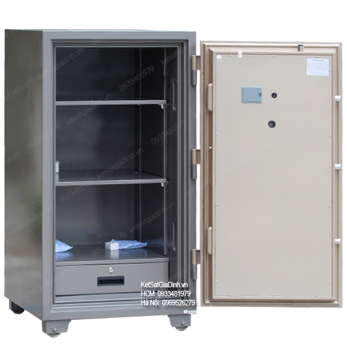 - Hệ thống khóa:Khóa mã điện tử + khóa chìa bi của hãng.Bàn phím điện tử tự sáng khi thao tác.Cài đặt mã số 3 – 8 ký tự, không giới hạn lần đổi.Có thể lắp pin bên trong hoặc bên ngoài két – tiện lợi khi thay pin