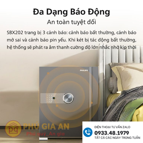 - Với ba phương thức mở khóa kết hợp vân tay, mã số và chìa cơ, Philips SBX202 sở hữu bảng khóa không giống bất kỳ sản phẩm nào khác. Hệ thống này nằm chìm trong cánh cửa két, vừa giúp nâng cao sự an toàn, vừa mang đến tính thẩm mỹ cao.