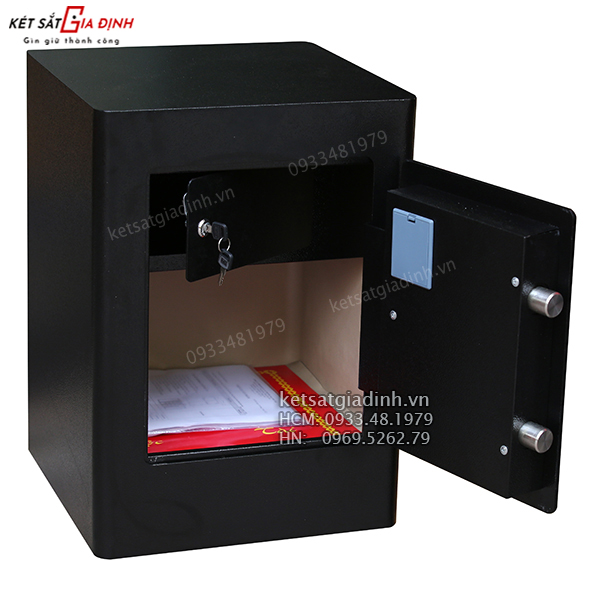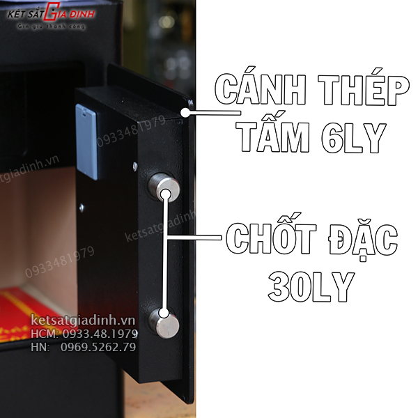 - Cấu trúc chắc chắn với thân két dày 3,5mm, cánh cửa thép tấm 6mm và chốt đặc 30mm, mang lại khả năng chống cạy phá vượt trội so với các dòng két thông thường.
