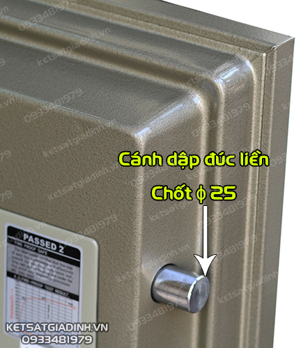 - Cánh cửa và thân két thép 2 lớp, kết hợp với ruột đúc đặc vật liệu chống cháy cao cấp theo tiêu chuẩn quốc tế (CE, ISO, SP, JIS). Cánh cửa được trang bị hệ thống chốt an toàn, tạo độ chắc chắn và bảo mật cao, giúp chống cạy phá hiệu quả.