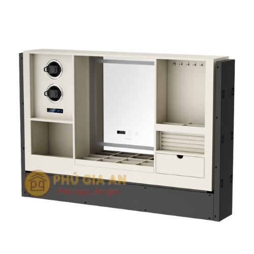 - Khi không sử dụng, tủ có thể ẩn vào trong kệ, giúp tiết kiệm không gian hiệu quả.